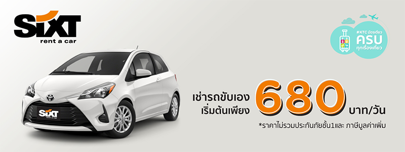 สิทธิพิเศษบัตรเครดิตเคทีซี รถเช่าราคาพิเศษ ที่ Sixt Rent A Car กับบัตรเครดิต KTC เช่ารถขับเองเริ่มต้น 680 บาทต่อวัน ราคาไม่รวมประกันภัยรถยนต์ (ECDW) 1, ประกันภัยยางรถยนต์, ประกันอุบัติเหตุส่วนบุคคล (PAI) และภาษีมูลค่าเพิ่ม