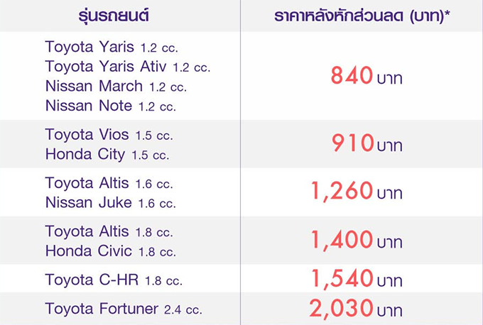 - Toyota Camry, Honda CR-V, Toyota Innova, Toyota Fortuner หรือรุ่นใกล้เคียง ราคา 1,299 บาท