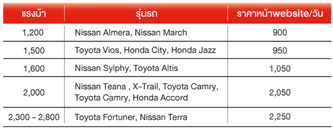 - รุ่นรถหรือเทียบเท่า Toyota Camry (2000cc) ราคา 1,999 บาท/วัน