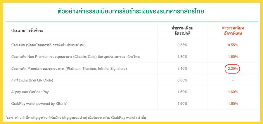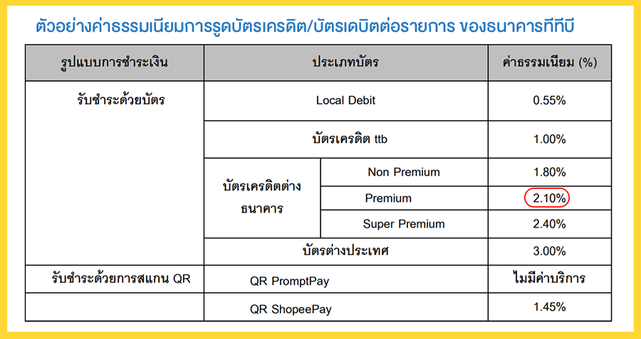 จากข้อมูลข้างต้น ค่าธรรมเนียมการรับชำระเงินของธนาคารกสิกรไทย ร้านค้าต้องจ่ายค่าธรรมเนียมในอัตราพิเศษที่ 2.20% ส่วนของธนาคารทหารไทยธนชาต ร้านค้าต้องจ่ายค่าธรรมเนียม 2.10% แต่เพื่อเป็นการอำนวยความสะดวกให้กับลูกค้า โดยเฉพาะร้านค้าในห้างสรรพสินค้าใหญ่ๆ ก็มักจะแบกรับภาระค่าใช้จ่ายในส่วนนี้ไว้เองค่ะ