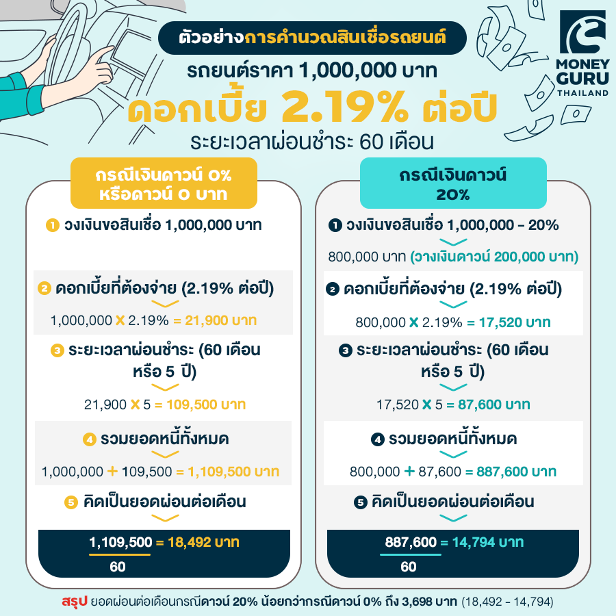 ในการซื้อรถยนต์ ราคาขายรถที่เราเห็นจะเป็นราคาที่รวม VAT 7% เรียบร้อยแล้ว หากเราซื้อรถยนต์โดยใช้โปรโมชั่นดาวน์ 0% หรือ ดาวน์ 0 บาทจริงๆ แบบที่ไม่มีเงื่อนไขอื่นๆ แอบแฝง การคำนวณดอกเบี้ยจะเป็นตามตัวอย่างด้านล่างนี้นะคะ