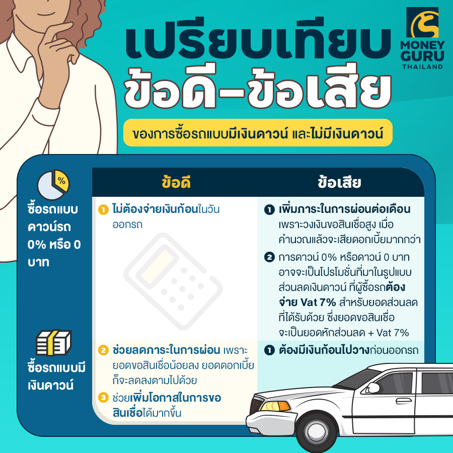 เป็นเส้นชัยตรงทางออก : สำหรับในกรณีดาวน์รถ 0% จะเป็นเส้นชัยของทางออก เพราะเราไม่ต้องวางเงินก้อนในวันออกรถ หากเรามีความจำเป็นต้องใช้รถในการทำมาหาเลี้ยงชีพจริงๆ และเราต้องแน่ใจว่ารถที่เราซื้อมาจะก่อให้เกิดรายได้เพิ่มแก่เราจริงๆ เพราะการซื้อรถนอกจากเงินที่ต้องเสียไปกับค่าผ่อนรถแล้ว ยังมีค่าเสื่อมราคาต่างๆ ที่ต้องเสียระหว่างปีอีก เราควรต้องทบทวนให้รอบคอบจริงๆ แล้วจึงค่อยตัดสินใจนะคะ