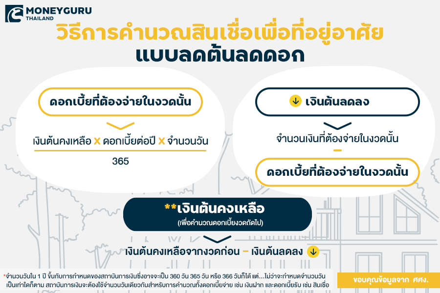 สำหรับการคำนวณสินเชื่อเพื่อที่อยู่อาศัย จะแตกต่างจากการคำนวณดอกเบี้ยเช่าซื้อรถยนต์ เพราะเป็นการคำนวณดอกเบี้ยแบบลดต้นลดดอก (Effective Rate) โดยจะคิดดอกเบี้ยจากเงินต้นคงเหลือในแต่ละงวด โดยมีสูตรการคำนวณ ดังนี้