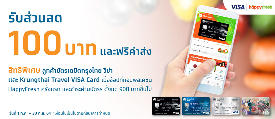 สิทธิพิเศษ ลูกค้าบัตรเดบิตกรุงไทย วีซ่า และ Krungthai Travel VISA Card เมื่อช้อปที่แอปพลิเคชัน HappyFresh ครั้งแรก และชำระผ่านบัตรฯ ตั้งแต่ 900 บาทขึ้นไป รับส่วนลด 100 บาท และฟรีค่าส่ง