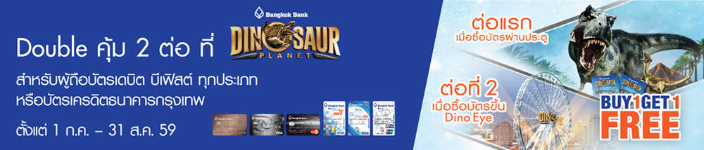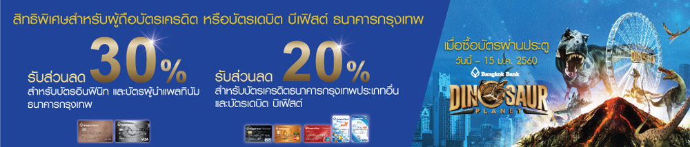 รายละเอียดโปรโมชั่น : สิทธิพิเศษสำหรับผู้ถือบัตรเครดิตและ บัตรเดบิต บีเฟิสต์ ธนาคารกรุงเทพ เมื่อซื้อบัตรเข้าชม Dinosaur Planet