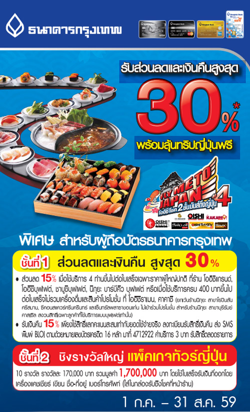 พิเศษ! สำหรับผู้ถือบัตรธนาคารกรุงเทพ รับส่วนลดและเงินคืนสูงสุด 30% พร้อมลุ้นทริปญี่ปุ่นฟรี