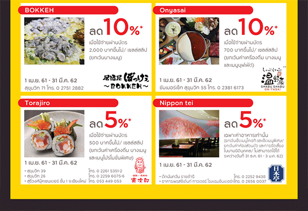 - รับส่วนลดสูงสุด 10% เมื่อทานที่ร้านอาหารญี่ปุ่นยอดนิยม 4 ร้าน คือ CHABUTON, MO-MO-PARADISE, OOTOYA และ SABOTEN