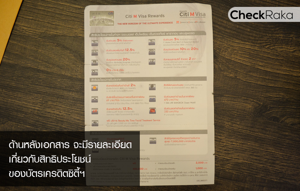 ด้านหลังเอกสารจะมีรายละเอียดสิทธิประโยชน์ของบัตรเครดิตซิตี้เอ็ม วีซ่า รีวอร์ด ทั้งสิทธิประโยชน์ ณ ห้างสรรพสินค้าในเครือ, สิทธิประโยชน์ภายในประเทศ และสิทธิประโยชน์ที่ใช้ได้ทั่วโลกค่ะ