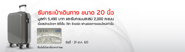 รับ 2,500 คะแนนสะสมซิตี้ รีวอร์ด เมื่อสมัครบัตรเครดิตซิตี้เอ็ม วีซ่า รีวอร์ด ผ่านทางออนไลน์ เพื่อนำ 500 คะแนนสะสม ไปแลกรับกระเป๋าเดินทาง Ultimate Trolley Bag ขนาด 20 นิ้ว มูลค่า 5,490 บาท จำนวน 1 ใบ