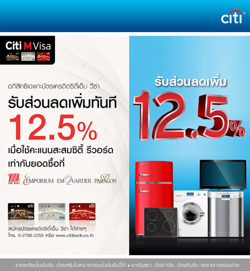 อภิสิทธิ์เฉพาะบัตรเครดิตซิตี้ เอ็ม วีซ่า... รับส่วนลดเพิ่มทันที 12.5% เมื่อใช้คะแนนสะสมซิตี้ รีวอร์ด เท่ากับยอดซื้อที่ เดอะมอลล์ เอ็มโพเรียม เอ็มควอเทียร์ พารากอน