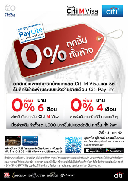 อภิสิทธิ์เฉพาะบัตรเดรดิตซิตี้ เอ็ม วีซ่า... รับสิทธิ์ชำระผ่านระบบแบ่งจ่ายรายเดือน Citi PayLite ผ่อน 0% นานสูงสุด 6 เดือน เมื่อชำระตั้งแต่ 1,500 บาทขึ้นไป/ เซลล์สลิป ทั้งห้างฯ