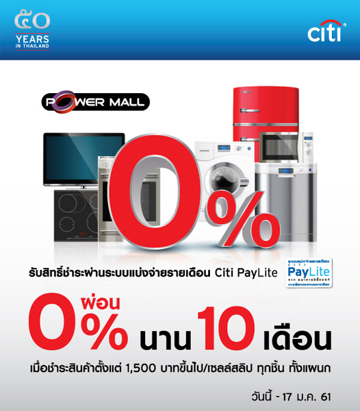รับสิทธิ์ชำระผ่านระบบแบ่งจ่ายรายเดือน Citi PayLite ผ่อน 0% นาน 10 เดือน เมื่อชำระค่าสินค้าตั้งแต่ 1,500 บาทขึ้นไป/ เซลล์สลิป ทุกชิ้น ทั้งแผนก ที่ Power Mall ทุกสาขา