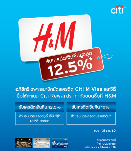 อภิสิทธิ์เฉพาะสมาชิกบัตรเครดิต Citi M Visa.. รับเครดิตเงินคืนสูงสุด 12.5% เมื่อใช้คะแนน Citi Rewards เท่ากับยอดซื้อที่ H&M ทุกสาขา