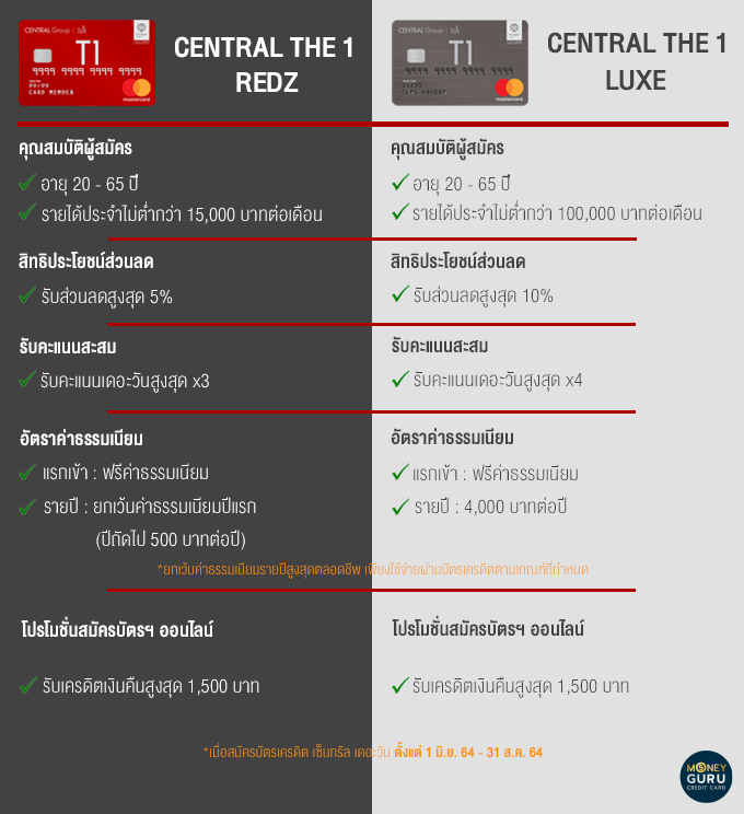 คุณสมบัติผู้สมัคร บัตรเครดิต เซ็นทรัล เดอะวัน เรดซ์ (Central The 1 REDZ Credit Card) บุคคลธรรมดาอายุ 20 - 65 ปี สำหรับบัตรหลัก อายุ 15 ปีขึ้นไป สำหรับบัตรเสริม เป็นผู้มีรายได้ประจำไม่ต่ำกว่า 15,000 บาทต่อเดือน หรือเป็นเจ้าของกิจการที่มีเงินทุนหมุนเวียนไม่ต่ำกว่า 231,000 บาทต่อเดือน หรือ เป็นผู้มีบัญชีเงินฝากและมีเงินอยู่ในบัญชีไม่น้อยกว่า 6 เดือน (บัญชีฝากประจำ ไม่น้อยกว่า 500,000 บาท, บัญชีออมทรัพย์ ไม่น้อยกว่า 1,000,000 บาท) หรือใช้บัญชีเงินฝากค้ำประกัน ไม่น้อยกว่า 40,000 บาท เอกสารประกอบการพิจารณา 1) สำหรับพนักงานบริษัท สำเนาบัตรประชาชน (ทั้งด้านหน้า-หลัง) สลิปเงินเดือนฉบับล่าสุด หรือ หนังสือรับรองเงินเดือนระบุเงินเดือนและอายุงาน สำเนาสมุดบัญชีออมทรัพย์ที่เงินเดือนโอนเข้าเดือนล่าสุด (กรณีใช้สลิปเงินเดือน) หรือสำเนาสมุดบัญชีออมทรัพย์ที่เงินเดือนโอนเข้าย้อนหลัง 6 เดือน (กรณีใช้หนังสือรับรองเงินเดือน) 2) สำหรับธุรกิจส่วนตัว สำเนาบัตรประชาชน (ทั้งด้านหน้า-หลัง) สำเนาสมุดบัญชีออมทรัพย์, กระแสรายวันย้อนหลัง 12 เดือน สำเนาหนังสือรับรองจดทะเบียนบริษัท / หจก. (เอกสารมีอายุไม่เกิน 6 เดือน) หรือ สำเนาใบทะเบียนการค้า สำเนารายชื่อผู้ถือหุ้นที่มีชื่อผู้สมัครร่วมด้วย (กรณีใช้สำเนาบัญชีออมทรัพย์ / กระแสรายวัน 12 เดือน) สำเนาสมุดบัญชีออมทรัพย์, กระแสรายวัน ย้อนหลัง 6 เดือน (กรณีใช้หนังสือรับรองจดทะเบียนบริษัท / หจก. / ใบทะเบียนการค้า) 3) สำหรับผู้ไม่มีรายได้ประจำ / ผู้มีบัญชีเงินฝาก สำเนาบัตรประชาชน (ทั้งด้านหน้า-หลัง) สำเนาสมุดบัญชีออมทรัพย์ และ/หรือ บัญชีเงินฝากประจำ 6 เดือนย้อนหลัง และหน้าสมุดบัญชีธนาคารหน้าแรก คุณสมบัติผู้สมัคร บัตรเครดิต เซ็นทรัล เดอะวัน ลักซ์ (Central The 1 LUXE Credit Card) บุคคลธรรมดาอายุ 20 - 65 ปี สำหรับบัตรหลัก อายุ 15 ปีขึ้นไป สำหรับบัตรเสริม เป็นผู้มีรายได้ประจำไม่ต่ำกว่า 100,000 บาทต่อเดือน หรือเป็นเจ้าของกิจการที่มีเงินทุนหมุนเวียนไม่ต่ำกว่า 1,540,000 บาทต่อเดือน หรือ เป็นผู้มีบัญชีเงินฝากประจำหรือออมทรัพย์ ไม่น้อยกว่า 1,000,000 บาทและมีเงินอยู่ในบัญชีไม่น้อยกว่า 6 เดือน หรือใช้บัญชีเงินฝากค้ำประกัน ไม่น้อยกว่า 125,000 บาท เอกสารประกอบการพิจารณา 1) สำหรับพนักงานบริษัท สำเนาบัตรประชาชน (ทั้งด้านหน้า-หลัง) สลิปเงินเดือนฉบับล่าสุด หรือหนังสือรับรองเงินเดือนระบุเงินเดือนและอายุงาน สำเนาสมุดบัญชีออมทรัพย์ที่เงินเดือนโอนเข้าเดือนล่าสุด (กรณีใช้สลิปเงินเดือน) หรือ สำเนาสมุดบัญชีออมทรัพย์ที่เงินเดือนโอนเข้าย้อนหลัง 6 เดือน (กรณีใช้หนังสือรับรองเงินเดือน) 2) สำหรับธุรกิจส่วนตัว สำเนาบั