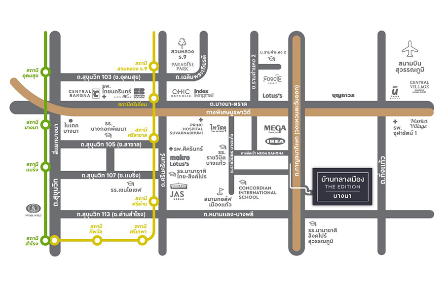 ขนส่งสาธารณะใกล้ทางด่วน (ทางพิเศษบูรพาวิถี, ทางด่วนวงแหวนกาญจนาฯ), ขนส่งอื่นๆ สนามบินสุวรรณภูมิ, ใกล้รถไฟฟ้า, บ้านติดรถไฟฟ้าสายสีเหลือง