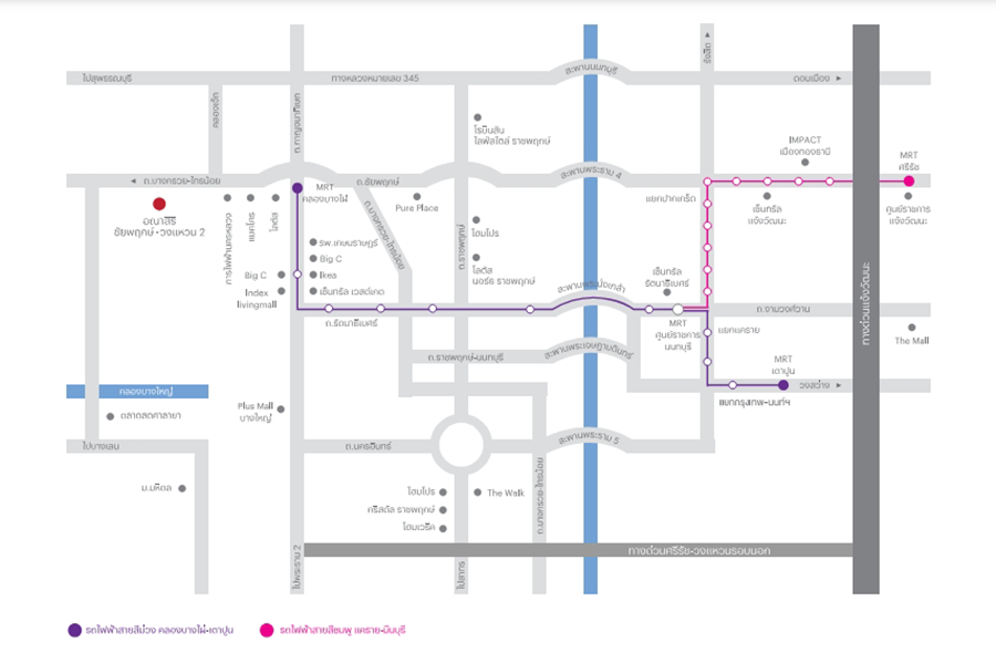 ขนส่งสาธารณะใกล้ทางด่วน (จุดขึ้นลงทางด่วนพิเศษศรีรัช-วงแหวนรอบนอก), ใกล้รถไฟฟ้า, บ้านติดรถไฟฟ้าสายสีม่วง MRT (บ้านติดรถไฟฟ้าสถานีคลองบางไผ่)