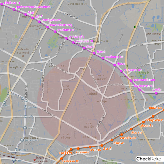 แผนที่รวมเส้นทางรถไฟฟ้าทั้ง 2 สาย บนย่านลาดพร้าว-เกษตรนวมินทร์ (