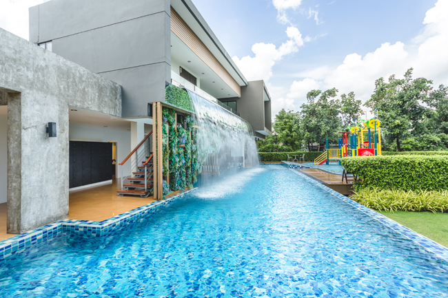 Clubhouse สไตล์โมเดิร์น มีจุดเด่นตรงที่มีน้ำตกลงมาจากชั้นสอง ตกลงลงมาที่สระว่ายน้ำด้านล่าง