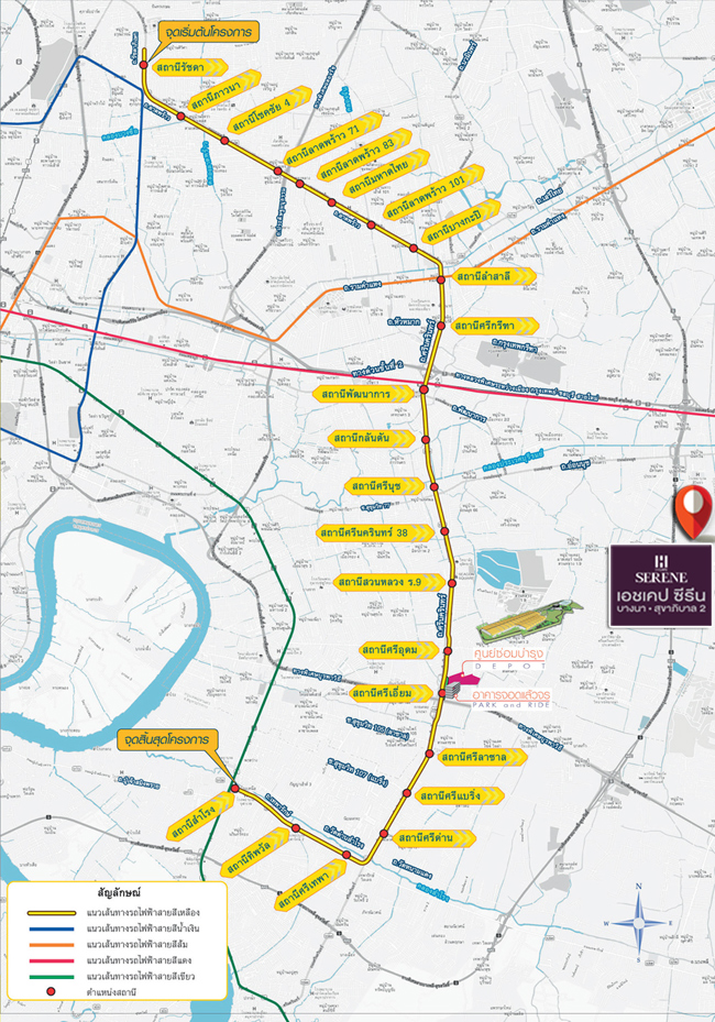 โครงการรถไฟฟ้าสายสีเหลือง ช่วงลาดพร้าว-สำโรง เป็นระบบขนส่งมวลชนประเภทรถไฟฟ้ารางเดี่ยว (Straddle Monorail) มีลักษณะเป็นโครงสร้างยกระดับตลอดแนวเส้นทาง มีระยะทางทั้งสิ้น 30.4 กิโลเมตรรวม 23 สถานีที่ใกล้โครงการมากที่สุดคือ สถานีศรีนุช ระยะทางประมาณ 8.7 กิโลเมตร