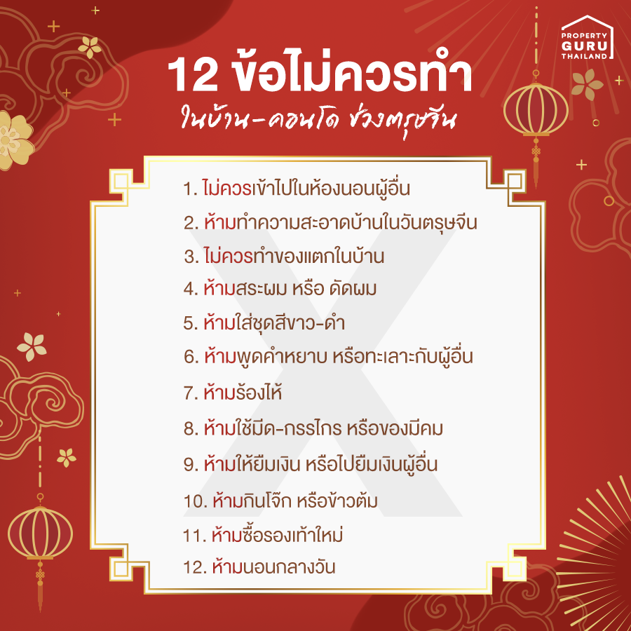 คนจีนมีความเชื่อว่า "บ้าน" นั้นถือเป็นสถานที่อันศิริมงคล ซึ่งในช่วงเทศกาลตรุษจีน ก็จะความเชื่อว่ามีสิ่งที่ ควร และไม่ควรทำ อยู่หลายข้อด้วยกัน เชื่อกันว่าหากปฏิบัติตามแล้วก็จะมีแต่โชคดีเกิดขึ้น วันนี้เราก็เลยรวบรวมความเชื่อในเรื่องที่ ควร และ ไม่ควรทำ ในช่วงตรุษจีนมาฝากกันด้วยค่ะ