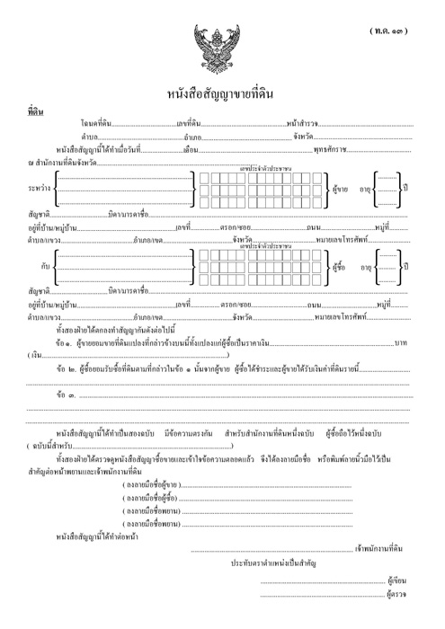 คำตอบคือ กฎหมายไม่ได้บังคับว่าต้องเซ็น แต่ในทางปฏิบัติควรเซ็น อธิบายง่ายๆ คือ กฎหมายไม่ได้บังคับว่าจะต้องทำ "สัญญาจะซื้อจะขาย" และกฎหมายอนุญาตให้ทำสัญญาครั้งเดียวได้เลยคือ "สัญญาซื้อขาย" ที่สำนักงานที่ดินในวันจดทะเบียนโอน แต่ในชีวิตจริง บ้านเป็นเรื่องใหญ่ และมีเรื่องที่ต้องใช้เวลามาก หรือตกลงกันเบื้องต้นก่อน เช่น คนซื้อต้องใช้เวลาขอสินเชื่อ และไม่ต้องการให้คนขายไปขายบ้านให้คนอื่น ในขณะที่คนขายก็ต้องการแน่ใจว่าคนซื้อจะซื้อจริง จึงอยากได้มัดจำจากคนซื้อไว้ก่อน ดังนั้นเพื่อประโยชน์ของทั้งคนซื้อและคนขาย จึงควรทำ "สัญญาจะซื้อจะขาย" กันไว้ก่อน เพื่อล็อคคนสองคนเข้าด้วยกันในเบื้องต้น และตกลงเรื่องสำคัญเหล่านี้ให้ชัดเจนกันก่อน ดังนั้นเวลาเราซื้อบ้านจัดสรรมือหนึ่ง เราจึงต้องเซ็นสองครั้ง คือ 1) สัญญาจะซื้อจะขาย ซึ่งกฎหมายไม่ได้บังคับว่าสัญญานี้จะต้องจดทะเบียนกับสำนักงานที่ดิน โดยวันที่เซ็นสัญญานี้กรรมสิทธิ์ในตัวบ้านจะยังไม่โอนให้คนซื้อ 2) สัญญาซื้อขาย ซึ่งกฎหมายบังคับให้ทำ และจดทะเบียนกับสำนักงานที่ดินมิฉะนั้นจะถือเป็นโมฆะ และมีชื่อเป็นทางการว่า "หนังสือสัญญาขายที่ดิน" (ท.ด. 13 ตามแบบข้างล่างนี้) โดยวันที่เซ็นสัญญานี้จะเป็นวันที่กรรมสิทธิ์ในตัวบ้านจะโอนมาเป็นของคนซื้อเสร็จเด็ดขาด