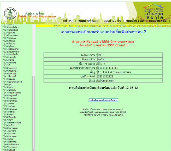 4. หลังจากนั้น เราจะได้รับ "เอกสารลงทะเบียน" โดยเราสามารถพิมพ์เอกสารนี้เพื่อไปรับแบบบ้านฟรีได้เลยที่สำนักงานโยธาเขตใดก็ได้ที่สะดวก โดยจะเสียค่าถ่ายเอกสารแบบบ้านเป็นจำนวนเงิน 80 บาทครับ