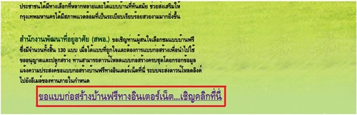 เลือกแบบบ้านจากโครงการต่างๆ (ในกรอบสีดำ) 2. หลังจากที่เลือกแบบได้แล้ว ให้จดชื่อแบบบ้านเอาไว้แล้วกดลิงค์ "ขอแบบก่อสร้างฟรีทางอินเตอร์เน็ต.. เชิญคลิกที่นี่"