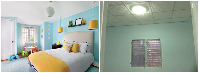 เจ้าของกระทู้มีภาพของบ้านที่อยากได้ในใจอยู่แล้ว หลักๆ เลยตัวบ้านก็อยากให้เป็นสีเหลืองและขาว ห้องข้างในอยากได้สีฟ้า และห้องน้ำโทนสีก็อยากได้ประมาณรูปข้างล่าง โดยขั้นตอนนี้ก็ขอให้เพื่อนที่เป็นสถาปนิกช่วยในการตกแต่ง และเลือกใช้อุปกรณ์ภายในบ้าน เรามาดูภาพเปรียบเทียบกันครับ