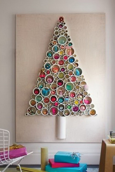 บนต้นคริสต์มาสมักจะมีกล่องของขวัญหลากชิ้นประดับประดาอยู่เต็มต้น แต่ถ้าเราไม่ได้ใช้เป็นต้นไม้มาติดกำแพง ลองหันมาใช้ท่อ PVC หลากขนาดมาผ่าแบ่งให้ได้หลายๆชิ้น ติดกาวเข้าด้วยกันเป็นรูปต้นคริสต์มาสดู แล้ววางเครื่องประดับที่ปกติใช้ห้อยกับต้นไม้มาวางไว้ในท่อแทน ทำให้ต้นคริสต์มาสจากท่อ PVC นี้ดูมีชีวิตชีวาและโดดเด่นทีเดียว