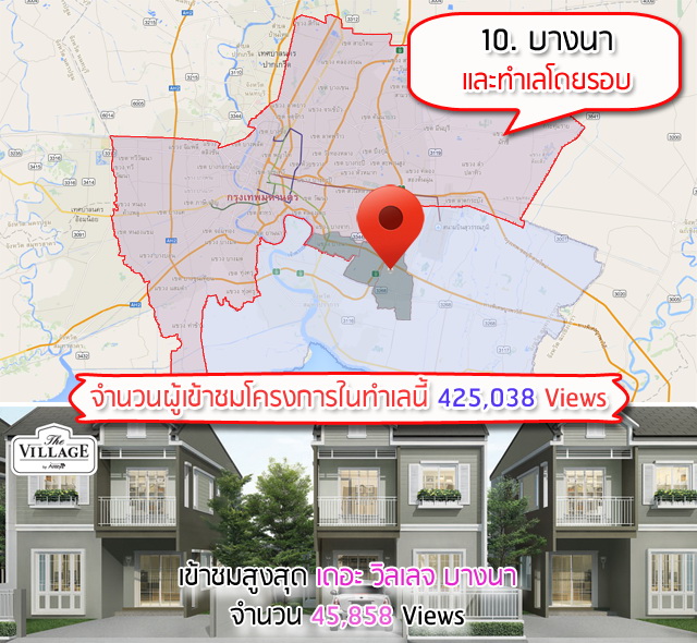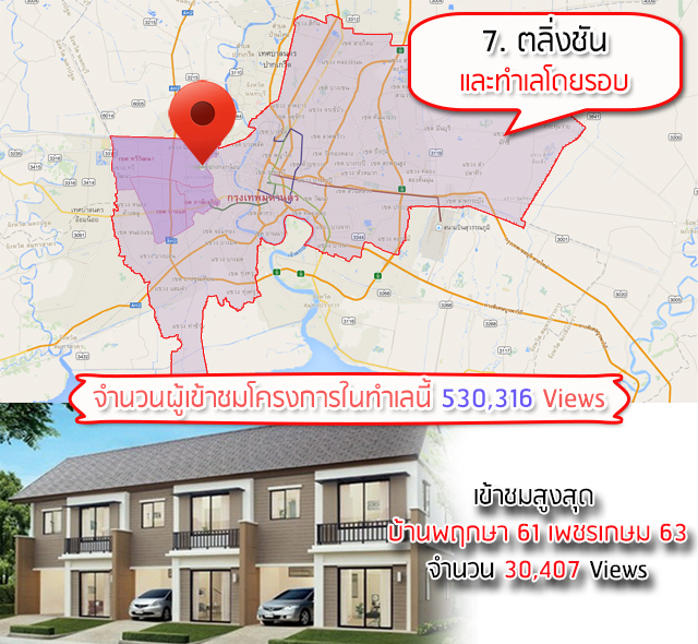 ปี 2557 กำลังจะผ่านไป และปี 2558 ก็กำลังจะก้าวเข้ามา วันนี้ทาง Checkraka.com เลยขอส่งท้ายปี 57 ด้วยการมองย้อนกลับไปดูสถิติตัวเลขคนเข้าชมโครงการบ้าน และทาวน์โฮมบนเว็บไซต์เราตลอดปี 57 ที่ผ่านมาเพื่อดูว่าคนค้นหา และเข้าชมข้อมูลบ้าน หรือทาวน์โฮมในย่านไหนในกรุงเทพ และปริมณฑลกันเยอะที่สุด ซึ่งตัวเลขเหล่านี้ก็น่าจะพอใช้เป็น Guideline บอกเป็นแนวทางทั่วไปได้ว่าทำเลไหนที่คนสนใจกันมากที่สุด สถิตินี้เป็นตัวเลขของทาง Checkraka เองที่บันทึกจำนวนคนเข้าดูโครงการต่างๆ ในแต่ละทำเลบนเว็บไซต์เรา สิ้นสุด ณ วันที่ 26 ธันวาคม 2557 ทำเลที่ได้อันดับ 1 ก็ไม่น่าแปลกใจค่ะ เพราะเป็นทำเลที่จะมีแนวรถไฟฟ้าไปถึงในอีกไม่กี่ปีข้างหน้านี้เอง ซึ่งก็คือ แถบนนทบุรีซึ่งประกอบไปด้วยโซนหลักๆ คือบางใหญ่ บางบัวทอง และปากเกร็ด