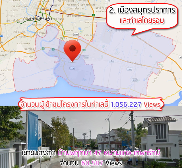 สำหรับอันดับ 2 ก็ยังคงอยู่ในโซนปริมณฑลซึ่งก็คือ บริเวณรอบๆ อำเภอเมืองสมุทรปราการนั่นเองค่ะ โซนนี้มีพื้นที่หลักๆ คือบางพลี บางบ่อ และพระประแดง โดย 3 อันดับแรกที่คนเข้าดูในเว็บไซต์เราเยอะที่สุดสำหรับโซนนี้เป็นของพฤกษาฯ เหมาไปหมดเลยค่ะ คือ