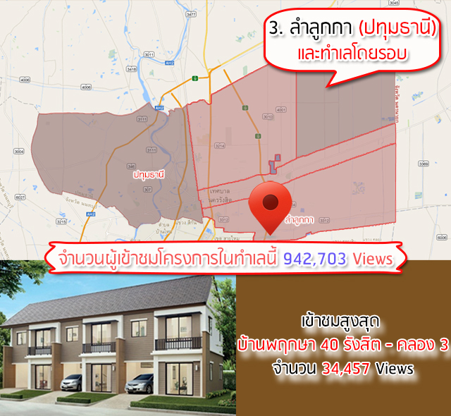 อันดับ 3 ก็ยังคงอยู่บริเวณปริมณฑลเช่นกันค่ะ โดยมีตัวเลขคนเข้าดูไม่ห่างจากอันดับ 2 มากนัก ซึ่งก็คือบริเวณรอบๆ จังหวัดปทุมธานี ประกอบไปด้วยโซนหลักคือลำลูกกา คลองหลวง และธัญบุรี โซนนี้มีโครงการบ้านหลายโครงการทีเดียวค่ะ มีหลายตัวเลือกให้เลือก และราคาก็ยังถือว่าไม่แพงมาก โดย 3 อันดับโครงการที่คนเข้าดูในเว็บไซต์เราเยอะสุดคือ