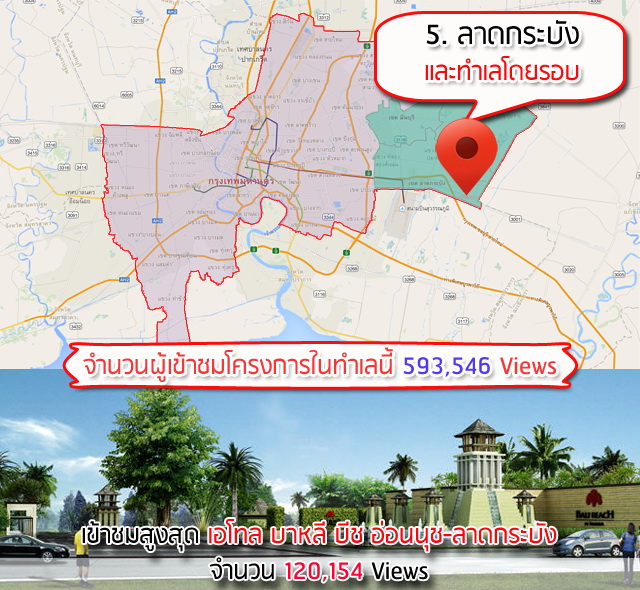 อันดับ 5 คือ โซนลาดกระบังและทำเลใกล้เคียง โซนนี้ถือว่ามีโครงการบ้านและทาวน์โฮมรองรับอยู่ค่อนข้างเยอะเช่นกันค่ะ และเป็นบริเวณที่เดินทางไปสนามบินสุวรรณภูมิได้ไม่ยาก โดยลำดับ 1 ที่คนเข้าดูเยอะสุดในโซนนี้แบบนำห่างไม่เห็นฝุ่นเลยเป็นโครงการของอนันดาฯ ค่ะ ส่วนอีก 2 โครงการที่ตามมาแบบห่างๆ เป็นดังต่อไปนี้ค่ะ