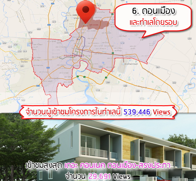 อันดับ 6 ดอนเมืองและทำเลใกล้เคียง เป็นทำเลที่ปัจจุบันเรียกได้ว่าไม่ไกลจากตัวเมืองกรุงเทพแล้ว เพราะมีทั้งทางด่วน และทางยกระดับดอนเมืองโทลล์เวย์เป็นตัวเชื่อมต่อ ในเรื่องของราคาเริ่มต้นในละแวกนี้ก็ยังถือว่ามีตัวเลือกที่ไม่แพงให้เลือกอยู่มากพอสมควร โดย 3 อันดับโครงการในโซนนี้ที่คนเข้าดูในเว็บไซต์เราสูงสุดคือ