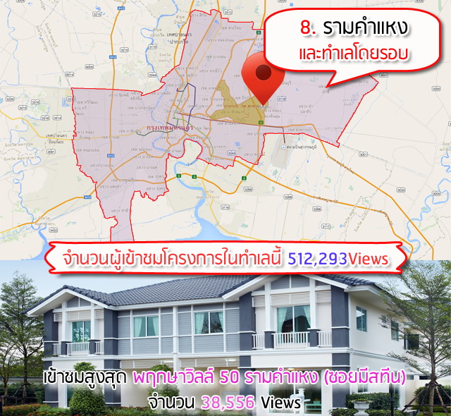 อันดับ 8 รามคำแหงและทำเลใกล้เคียงรวมถึงย่านบางกะปิ และเสรีไทย บริเวณนี้มีหลายโซนที่ค่อนข้างน่าอยู่ เช่น ซอยมิสทีน และอีกหน่อยก็จะมีรถไฟฟ้าสายสีส้มวิ่งผ่านด้วย โดยลำดับ 1 ตกเป็นของโครงการพฤกษาฯ (อีกแล้ว) ส่วนอีก 2 ลำดับรองลงมาคือ