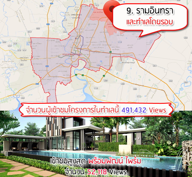 อันดับ 9 รามอินทราและทำเลใกล้เคียง เช่น เกษตร-นวมินทร์ และสายไหม โซนนี้มีบ้านและทาวน์โฮมอยู่หลายระดับ หลายราคา ทำให้ผู้ที่สนใจย่านนี้มีหลายระดับชนชั้น จึงน่าจะเป็นอีกตัวเลือกนึงที่น่าสนใจของหลายๆ คน โดยโครงการบ้านพร้อมพัฒน์ของแสนสิรินำมาในลำดับ 1 สำหรับย่านนี้ ทิ้งห่างลำดับ 2 อยู่พอสมควร ส่วนอีก 2 ลำดับโครงการที่มีคนเข้าดูในเว็บไซต์เราสูงสุดรองลงมาคือ