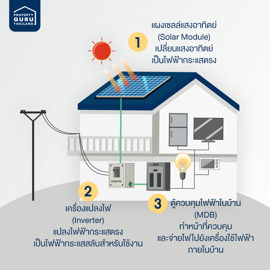 โดยหลักการทำงานก็คือ เมื่อได้รับพลังงานแสงอาทิตย์มาแล้ว จะเปลี่ยนเป็นไฟฟ้ากระแสตรง (DC) แล้วส่งไปยังเครื่องแปลงกระแสไฟฟ้า ที่เรียกว่า Inverter แล้วเปลี่ยนไฟฟ้ากระแสตรงให้เป็นกระแสสลับ (AC) เราก็จะได้พลังงานไฟฟ้าไปใช้งานในบ้านได้ ทั้งหลอดไฟ ตู้เย็น ทีวี พัดลม และถ้ายังมีกระแสไฟฟ้าเหลือก็สามารถนำไปขายให้กับหน่วยงานของรัฐ หรือเอกชนได้อีกด้วย