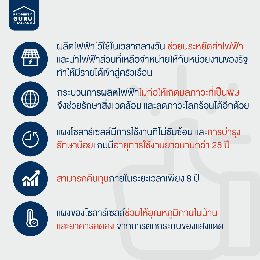 - สมมติฐานการคำนวณการคืนทุนใน 8 ปี เป็นการคำนวณจากกำลังการผลิตที่ 10 KW