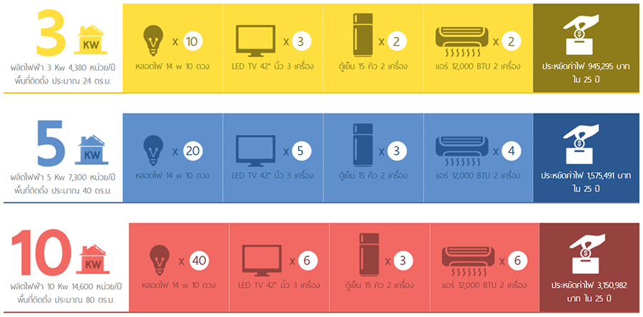 - สมมติฐานคำนวณการประหยัดไฟฟ้าได้ภายใน 25 ปี คำนวณจากอัตราค่าไฟฟ้า 5 บาท/หน่วย และปรับเพิ่มร้อยละ 5 ต่อปี