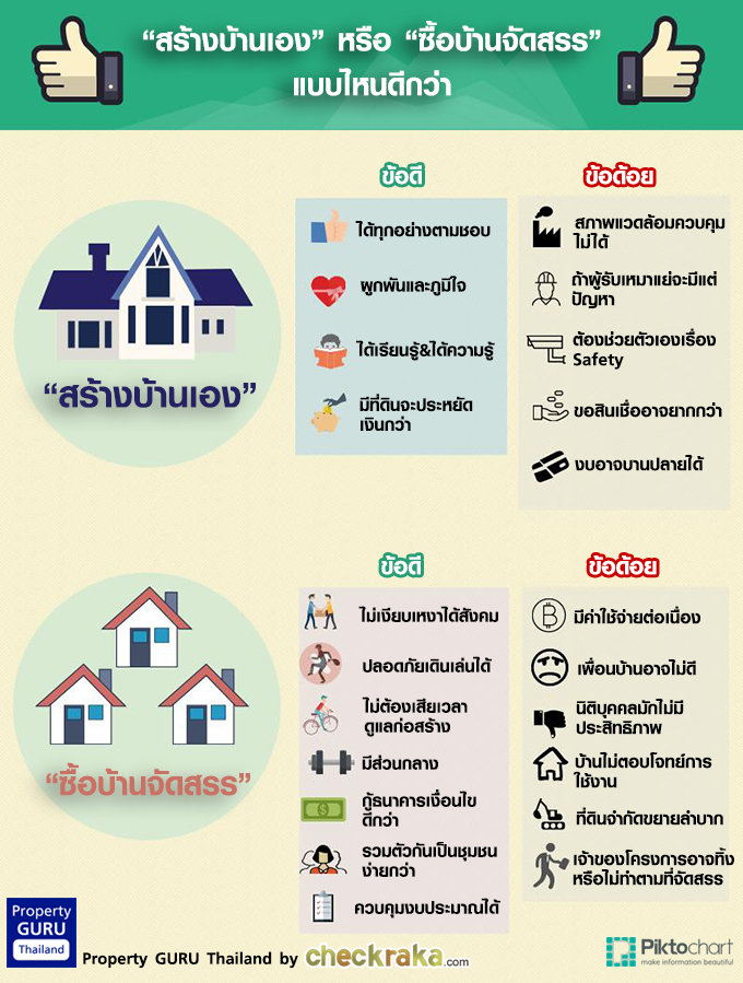 ผมว่าคำถามนี้คงไม่มีคำตอบตายตัวครับ ทั้งสองแบบมีข้อดี และข้อเสีย และตอบโจทย์คนแต่ละคนไม่เหมือนกัน บางคนอาจพบกันครึ่งทางโดยเอาข้อดีของทั้งสองแบบมารวมกัน คือเข้าไปซื้อที่ดินเปล่าในหมู่บ้านจัดสรร แล้วปลูกบ้านตามแบบที่ตัวเองชอบบนที่ดินเปล่านั้น ซึ่งก็อาจทำได้สำหรับในบางโครงการ หากคุณเป็นคนหนึ่งที่ยังตัดสินใจไม่ได้ว่าจะเอาแบบไหนดี ทางเราก็มี Checklist คร่าวๆ ที่อาจช่วยให้พวกเราตัดสินใจกันง่ายขึ้นครับ