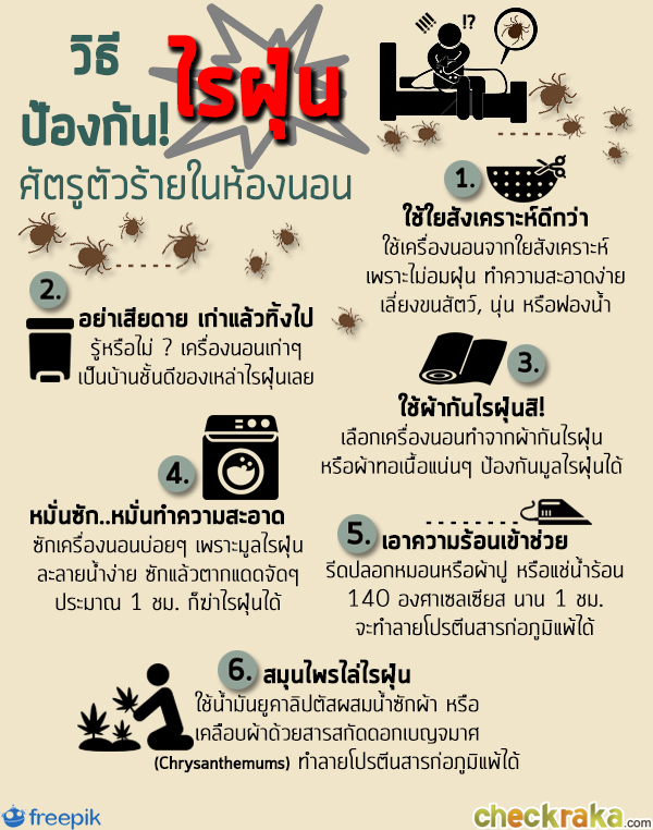 "ห้องนอน" เป็นมุมส่วนตัวที่เราใช้ชีวิตพักผ่อนมากที่สุด และแน่นอนว่าการนอนหลับพักผ่อนที่ดีนั้น ปัจจัยสำคัญที่จะส่งผลดีต่อตัวเราก็คือเรื่อง "ความสะอาด" ค่ะ ห้องนอนควรเป็นสถานที่ที่สะอาด ปราศจากฝุ่นละอองหรือสิ่งสกปรก ยิ่งห้องสกปรกและมีฝุ่นมากเท่าไหร่ ก็ยิ่งเป็นบ้านอันแสนอบอุ่นของ "ไรฝุ่น" ศัตรูตัวร้ายที่เป็นตัวก่อโรคต่างๆ วันนี้ Checkraka.com มีเคล็ดลับง่ายๆ ในการเลือกของใช้ภายในห้องนอน รวมถึงวิธีป้องกันไรฝุ่น ตัวการที่อาศัยอยู่ในห้องนอนซึ่งก่อให้เกิดโรคภูมิแพ้มาฝากกันค่ะ