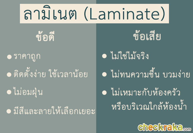 ลามิเนต เป็นวัสดุที่ได้รับความนิยมสูงสุดในปัจจุบันค่ะ พบได้บ่อยๆ ในคอนโดและบ้านเลย เนื่องจากราคาไม่สูง แต่มีคุณสมบัติที่ดีครบครัน ลามิเนตไม่ใช่ไม้จริง 100% แต่เกิดจากการนำเศษไม้มาผ่านกระบวนการทางวิทยาศาสตร์ ลามิเนตหาซื้อได้ง่าย มีลวดลายและสีสันให้เลือกจุใจ แต่ข้อเสียที่เห็นได้ชัดคือ กลัวน้ำสุดๆ น้ำหกต้องรีบเช็ด ไม่เหมาะกับพื้นที่ชื้นหรือโดนน้ำบ่อยๆ ไม่แนะนำให้ปูลามิเนตที่พื้นบ้านชั้นล่าง เพราะความชื้นจากพื้นดินจะทำให้อายุการใช้งานสั้นลงค่ะ