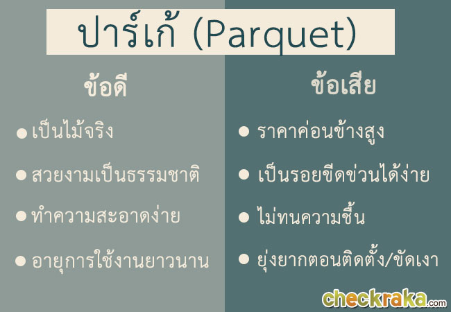 ปัจจุบันวัสดุปูพื้นบ้านหรือคอนโดมีให้เลือกหลากหลาย เรียกว่าเยอะจนเลือกไม่ถูก ปัจจัยหลักที่จะทำให้รู้ว่าเราควรจะปูพื้นบ้านด้วยวัสดุอะไรก็คือเรื่องของ "การใช้งาน" นั่นเองค่ะ เช่น บ้านที่เลี้ยงหมาแมว มีรอยขีดข่วนจากกรงเล็บ ก็ควรเลือกวัสดุที่เป็นรอยได้ยาก หรือ บ้านที่มีเด็กและผู้สูงอายุ ก็ต้องเป็นวัสดุปูพื้นที่ไม่ลื่น เดินง่าย เพื่อป้องกันอุบัติเหตุ เป็นต้น วันนี้ Checkraka.com รวมวัสดุปูพื้นยอดนิยมมาฝากกันค่ะ ใครที่มีแผนสร้างบ้านใหม่หรือรีโนเวทบ้าน สามารถดูเป็นข้อมูลช่วยตัดสินใจได้เลยค่ะ