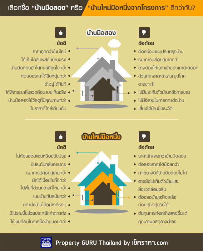 อยากซื้อบ้านแสนสุขไว้อยู่อาศัยสักหลัง นอกจากต้องดูทำเลที่ตั้ง งบประมาณแล้ว ตัวเลือกในการตัดสินใจอีก 2 ช้อยส์อย่าง.. เลือกซื้อบ้านใหม่จากโครงการที่ครอบครัวเราจะได้เข้าอยู่อาศัยเป็นคนแรก หรืออีกทางเลือกอย่าง.. ซื้อบ้านมือสองสภาพดีจากเจ้าของเดิมมาตกแต่งใหม่ เพราะทั้งบ้านใหม่และบ้านมือสองก็มีทั้งจุดเด่น จุดด้อยที่น่าสนใจไม่แพ้กัน ทีมงานบ้านของ CheckRaka.com ได้รวบรวมข้อดีข้อเสียของสองตัวเลือกทั้งบ้านเก่ามือสองและบ้านใหม่มือหนึ่ง มาให้เพื่อนๆ ได้พิจารณากันค่ะ