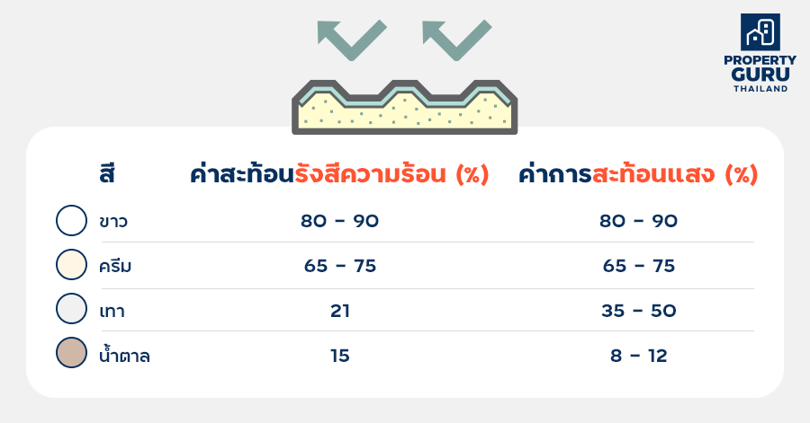 - ความเข้มของสี ทั้งภายนอก และภายใน ควรใช้สีอ่อน จะช่วยสะท้อนรังสีความร้อนออกสู่ภายนอกอาคาร ในส่วนภายในก็จะทำให้กระจายแสงภายในได้ดี