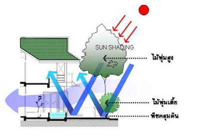 ภาพแสดงทิศทางแสงแดด และการปลูกต้นไม้เพื่อช่วยลดการสะท้อนความร้อนเข้าสู่ตัวอาคาร