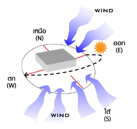 เนื่องจากประเทศไทยมีภูมิอากาศแบบร้อนชื้น การหันหน้าอาคารควรหันให้ด้านยาวรับประโยชน์จากการระบายอากาศด้วยลมธรรมชาติ และหลีกเลี่ยงรังสีความร้อนโดยตรง หากมีรูปแบบบ้านเป็นสี่เหลี่ยมผืนผ้า ควรหันให้ด้านยาวหันไปทางทิศเหนือ และทิศใต้ ส่วนด้านสั้นให้หันไปทางทิศตะวันออก และทิศตะวันตก โดยตามหลักการโคจรของโลกรอบดวงอาทิตย์ แดดจะแรงในช่วงเวลา 10.00 - 14.00 น. ของวัน