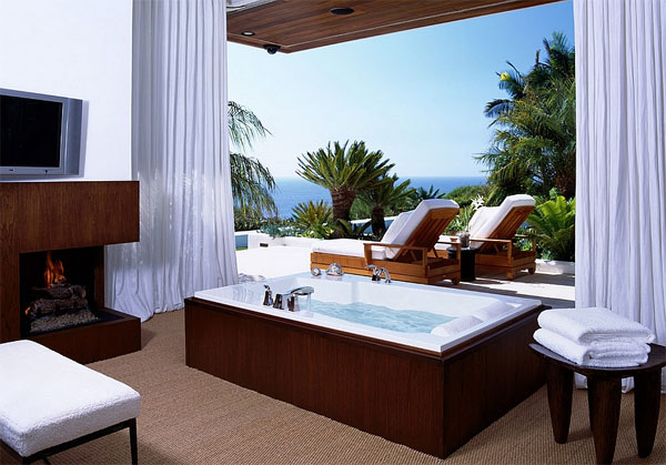 ห้องน้ำกลางแจ้งที่ตกแต่งด้วยหลังคากระจกใส ที่ให้คุณนอนแช่น้ำอาบแสงอาทิตย์อุ่นๆ ในยามเช้า
