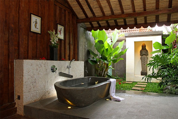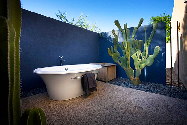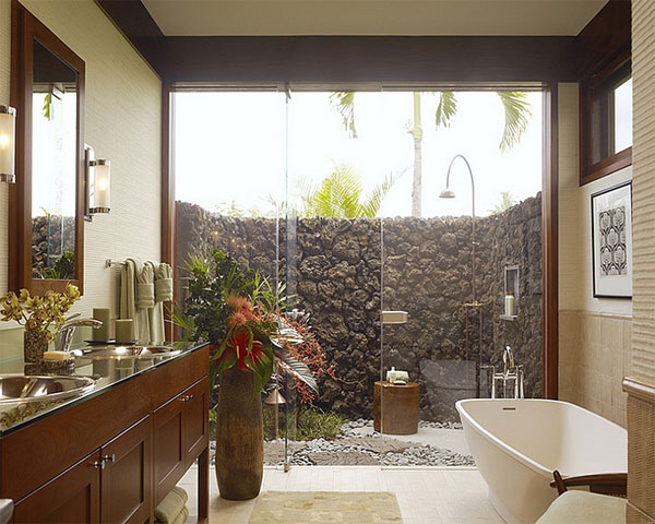 การจะมีห้องน้ำกลางแจ้งแบบที่แนบชิดธรรมชาติแต่ผสานไว้ซึ่งความเรียบหรูอยู่ในที บางครั้งอาจจะไม่ยากอย่างที่คิด เพียงหาสวนหรือพื้นที่ที่มีความเป็นส่วนตัว สร้างเป็นพื้นที่อาบน้ำกลางแจ้ง โดยเลือกวัสดุจากธรรมชาติอย่าง หิน หรือไม้ นำมาเป็นส่วนประกอบในการตกแต่ง เพิ่มความสดชื่นและร่มรื่นด้วยพรรณไม้นานาชนิด ติดตั้งอ่างอาบน้ำ อ่างจากุซซี่ และฝักบัวรูปทรงเรียบหรู โก้เก๋ เข้าไป เพียงแค่นี้ก็ได้ห้องน้ำที่สุดแสนจะผ่อนคลายเป็นของตัวเองแล้ว