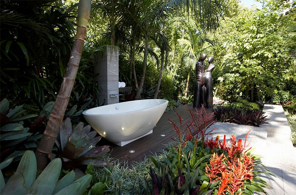 สำหรับบ้านที่ไม่มีพื้นที่เชื่อมต่อเข้ากับห้องน้ำเดิมที่มีอยู่ ก็ใช่ว่าจะเป็นปัญหา เพียงแค่หามุมสวนที่เงียบสงบ และเป็นส่วนตัวที่ปลีกตัวออกมาจากตัวบ้าน หรืออาจจะตั้งอยู่เดี่ยวๆ ในมุมใดมุมหนึ่งของบ้านนำมาปรับเปลี่ยนให้กลายเป็นห้องน้ำกลางแจ้งส่วนตัว ด้วยการติดตั้งอ่างอาบน้ำดีไซน์เก๋สำหรับนอนแช่ตัวภายใต้ท้องฟ้าและแสงดาว พร้อมชุดโต๊ะเก้าอี้สำหรับนั่งพักผ่อนน่ารักๆ สไตล์วินเทจ หรือสไตล์โบฮีเมียนสักชุด เพียงแค่นี้คุณก็มีห้องอาบน้ำกลางท่ามกลางธรรมชาติภายในบ้านแล้วค่ะ